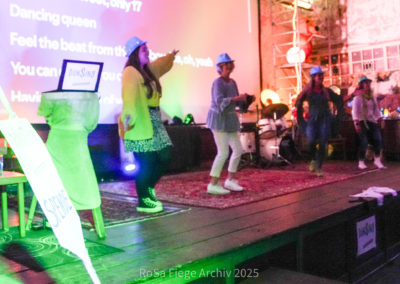Getreu ihrem Motto „Laut muss, schön darf“ animierten sie das Publikum zum stimmgewaltigen Mitmachen. Unterstützt von rund 160 Gästen wurde gesungen, getanzt und charmant durch den Abend moderiert. Die Songs aus diversen Jahrzehnten kamen vom Band, die Texte vom Beamer und die Stimmung von Herzen. Zu „No no never“ von Texas Lightning schwangen die DänSing-Queens ihre Cowboyhüte, begrüßten das „Liebe Glück“ von Max Raabe, philosophierten über „Leichtes Gepäck“ von Silbermond und feierten ab zu Gloria Gaynors „I will survive“. Mittendrin flogen sogar – eigens mit DänSing-Logo designte – Dessous auf die Bühne. Auf derart humorvolle Weise brachte eine besonders kreative Anhängerin ihre Begeisterung zum Ausdruck und sorgte so für einen unvergesslichen Show-Moment.