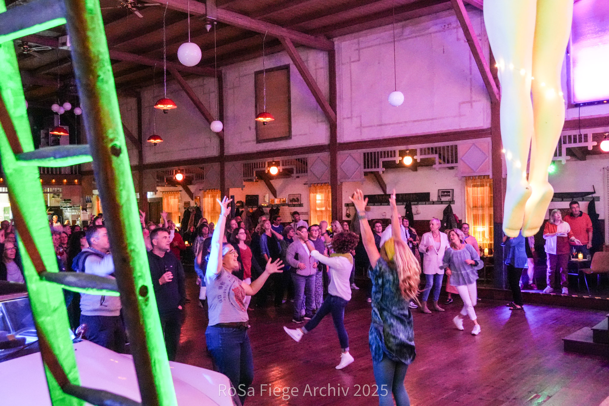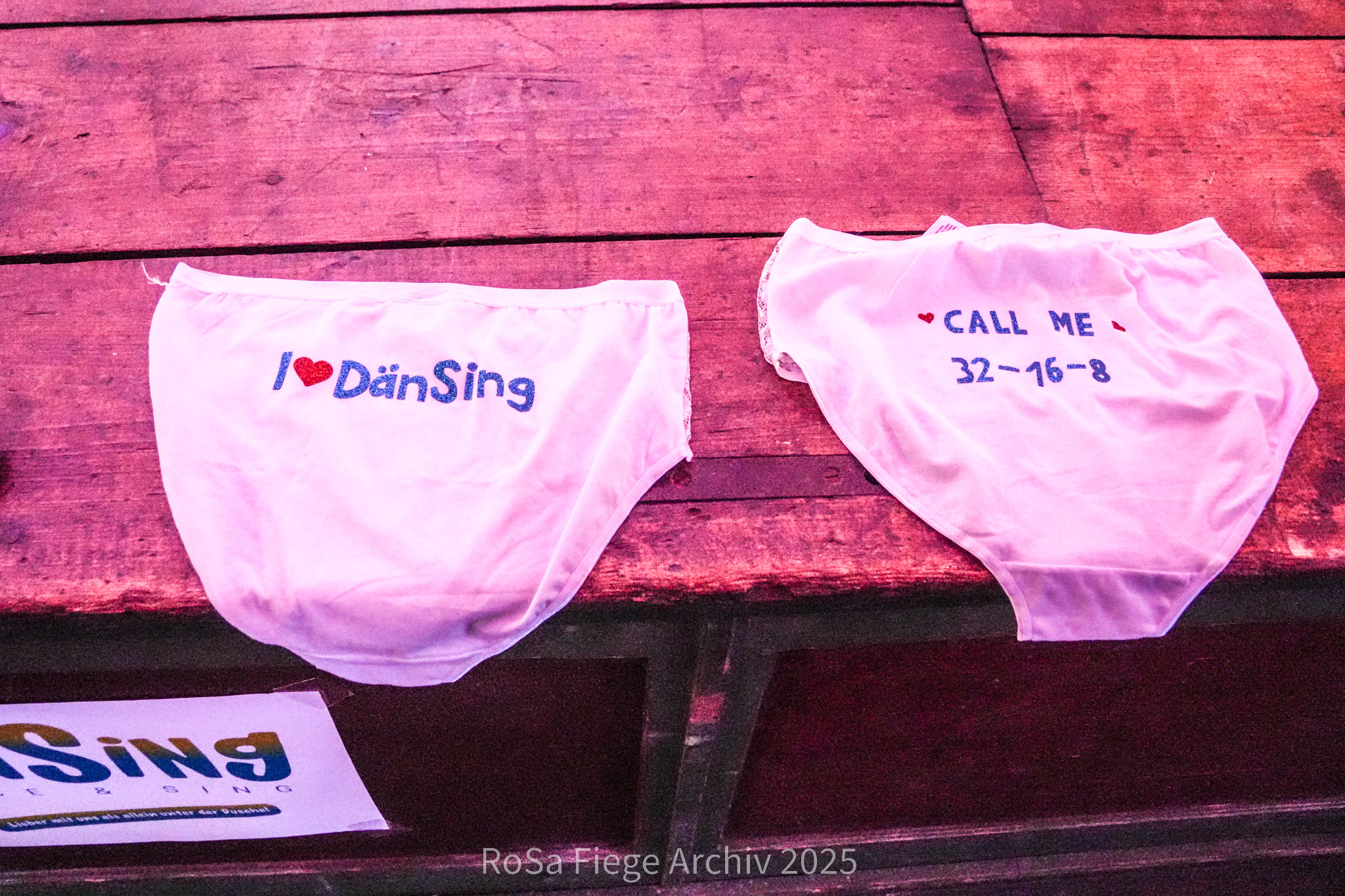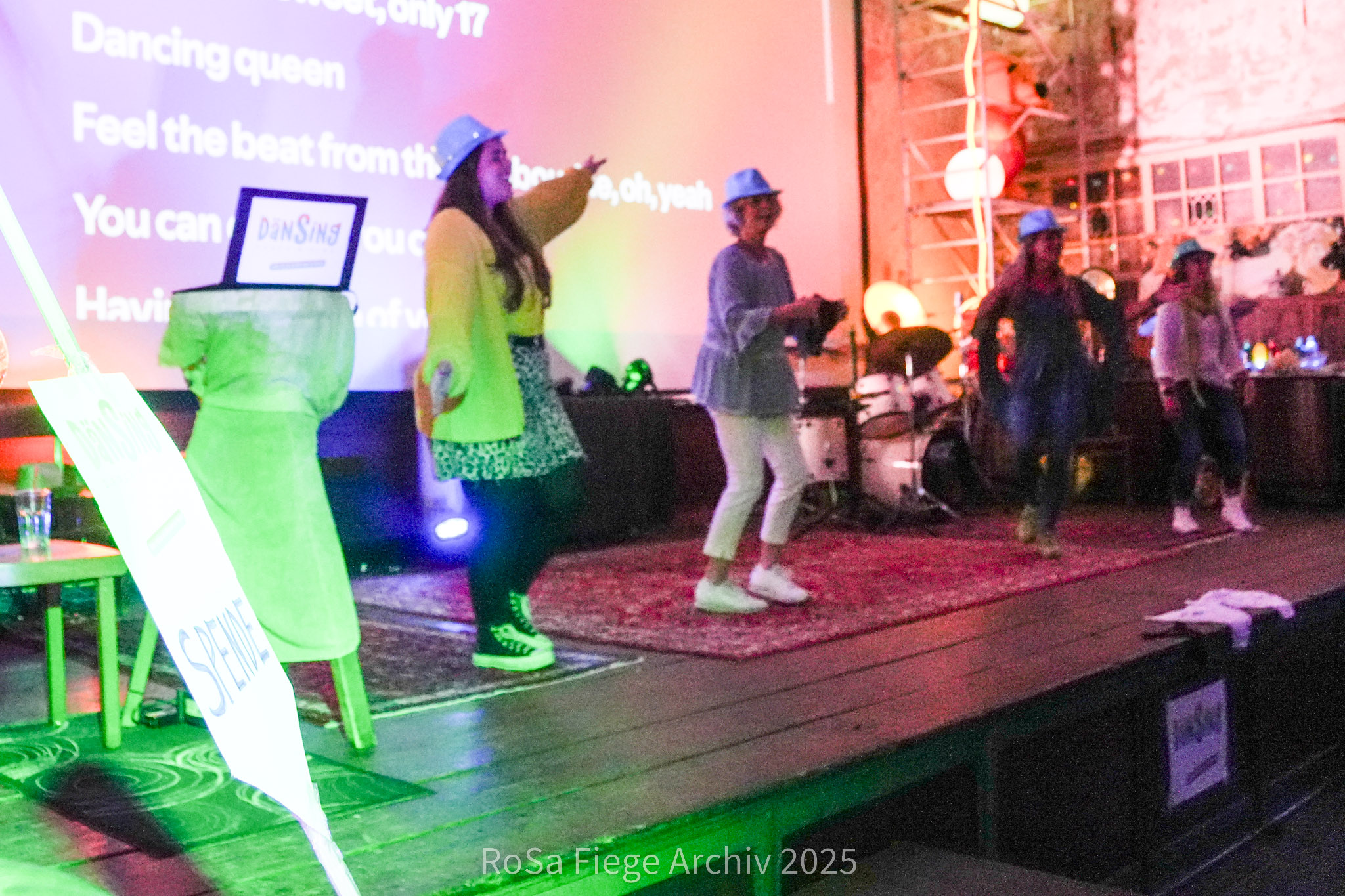Getreu ihrem Motto „Laut muss, schön darf“ animierten sie das Publikum zum stimmgewaltigen Mitmachen. Unterstützt von rund 160 Gästen wurde gesungen, getanzt und charmant durch den Abend moderiert. Die Songs aus diversen Jahrzehnten kamen vom Band, die Texte vom Beamer und die Stimmung von Herzen. Zu „No no never“ von Texas Lightning schwangen die DänSing-Queens ihre Cowboyhüte, begrüßten das „Liebe Glück“ von Max Raabe, philosophierten über „Leichtes Gepäck“ von Silbermond und feierten ab zu Gloria Gaynors „I will survive“. Mittendrin flogen sogar – eigens mit DänSing-Logo designte – Dessous auf die Bühne. Auf derart humorvolle Weise brachte eine besonders kreative Anhängerin ihre Begeisterung zum Ausdruck und sorgte so für einen unvergesslichen Show-Moment.